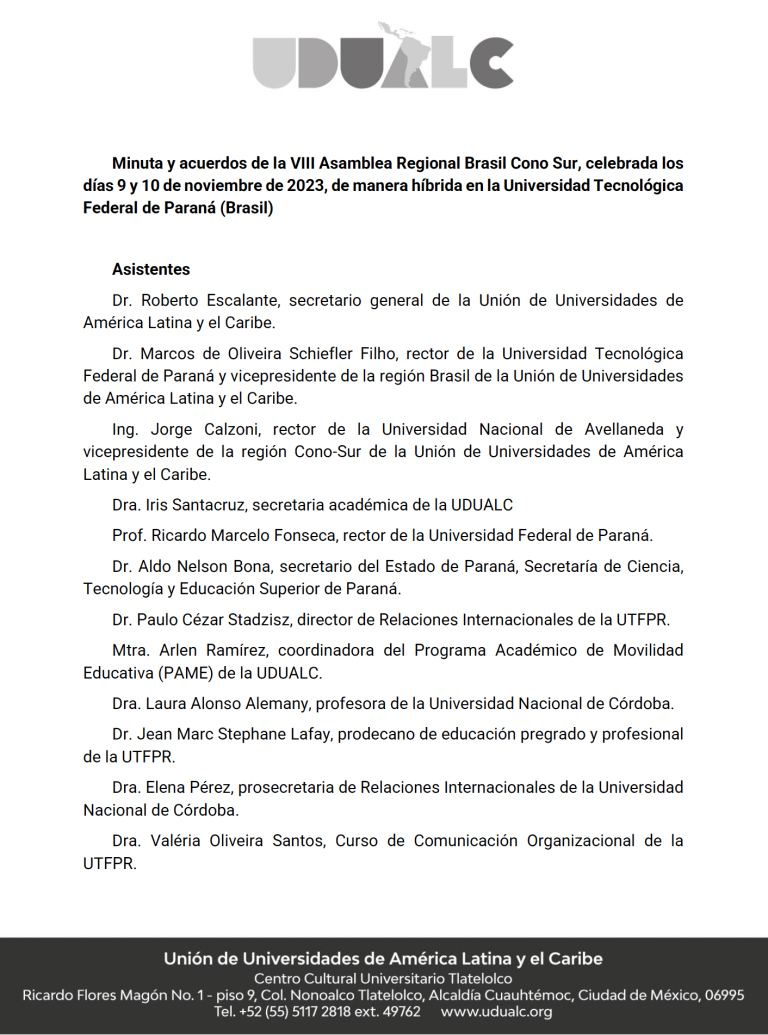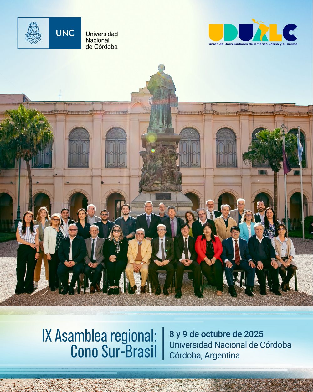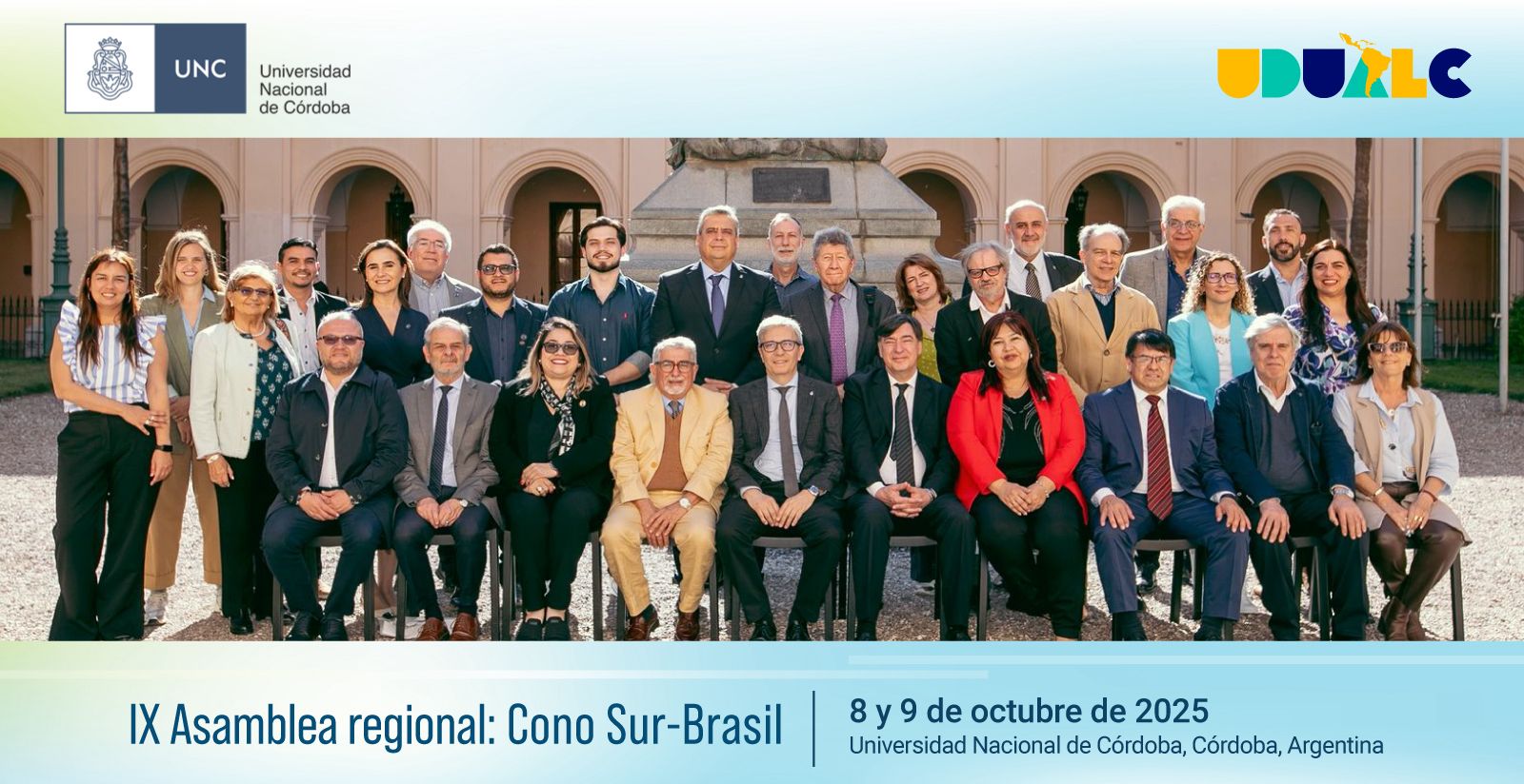 La Unión de Universidades de América Latina y el Caribe (UDUALC) convoca a sus afiliadas a participar en la IX Asamblea Regional: Brasil-Cono Sur, que se llevará a cabo, de forma híbrida, en la ciudad de Córdoba, Argentina, en las instalaciones de la Universidad Nacional de Córdoba (UNC), los días 8 y 9 de octubre del presente año.
